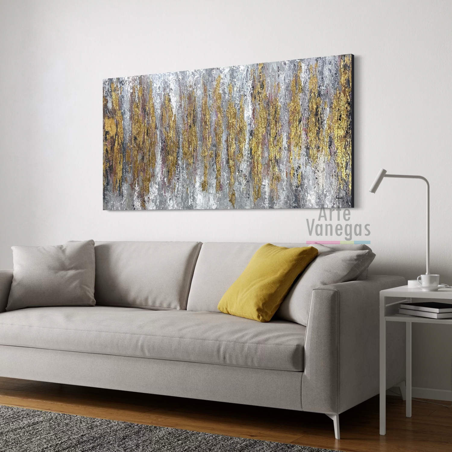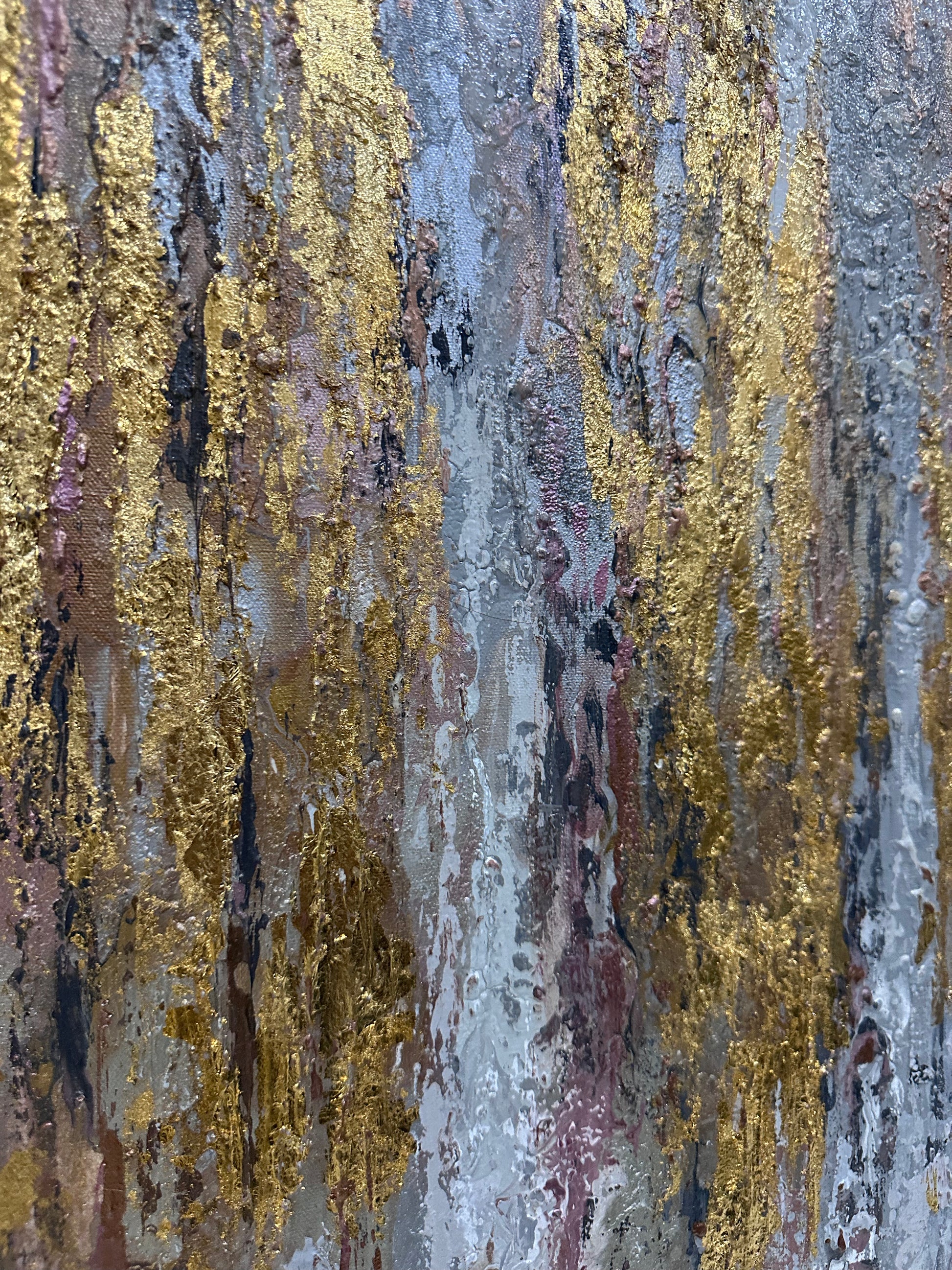 Obra Abstracta en tonos grises y palo de rosa con laminilla dorada.