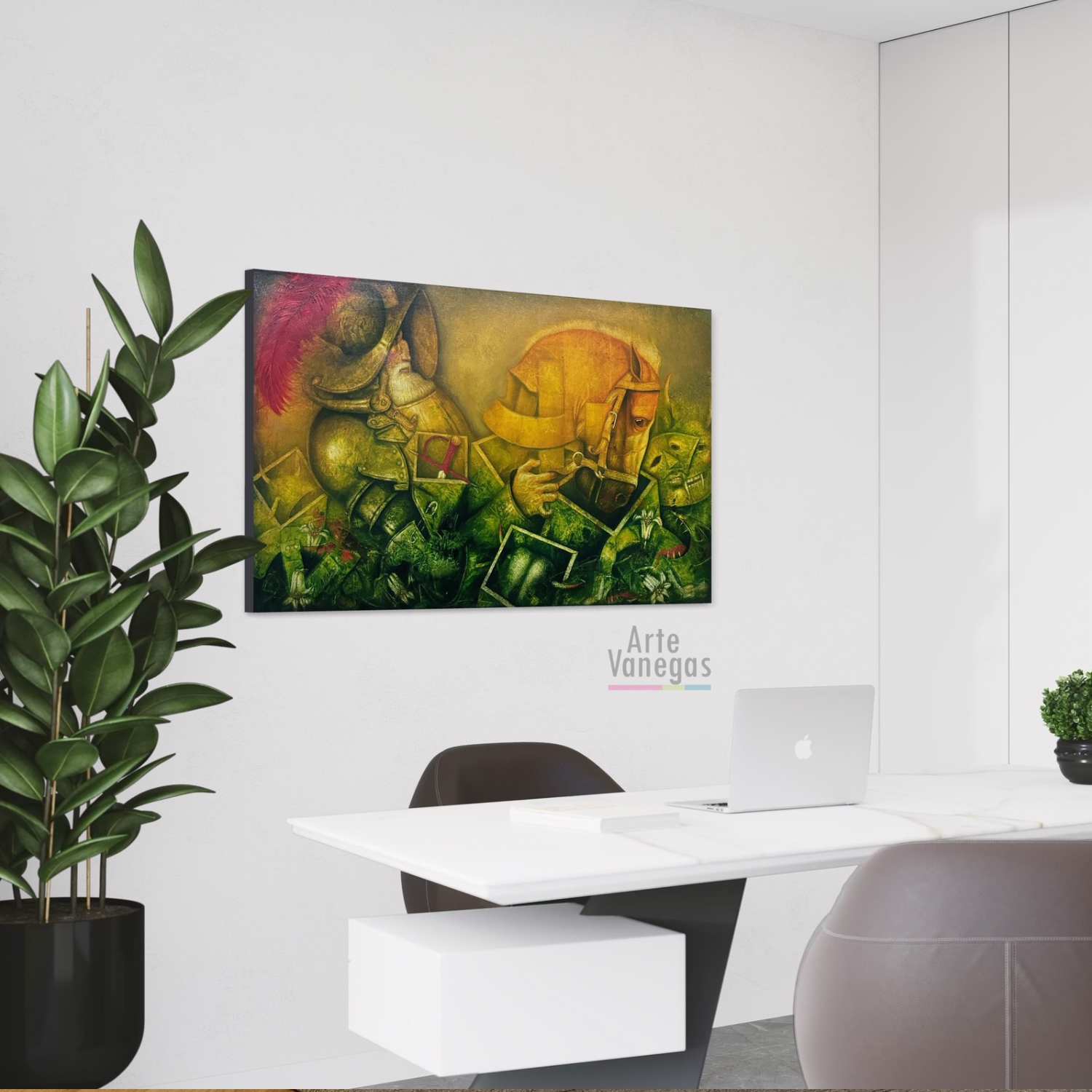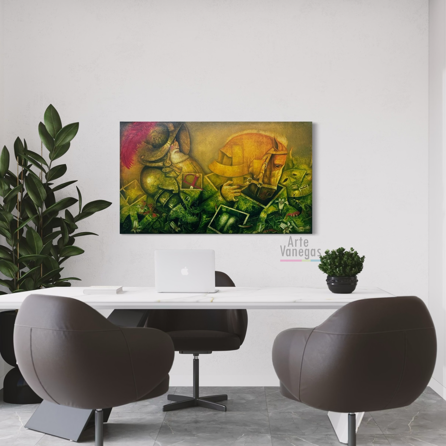 Obra “Conquistador” del Maestro Fernando Gallardo de 70x120 cm elaborado en oleo sobre lienzo, es una obra con bastantes detalles e ilustraciones.